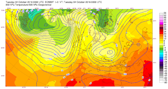 El ramal descendente de la dorsal atlántica progresa hacia el sur menos de lo que cabría esperar -bien sea por falta de suficiente velocidad o por interferencia con la circulación subtropical. Se inicia la transformación de la vaguada en una borrasca fría al oeste de Galicia.